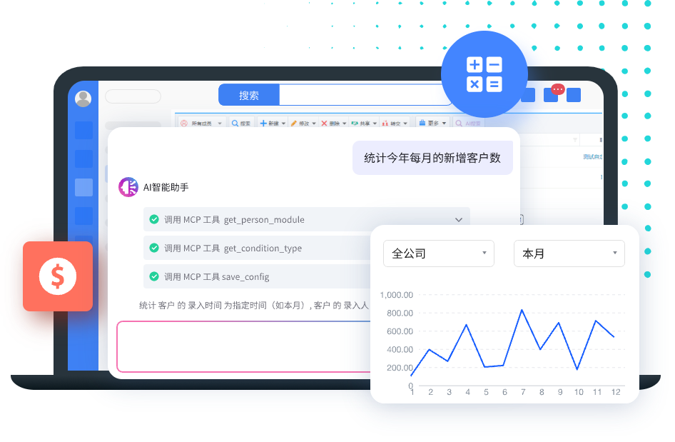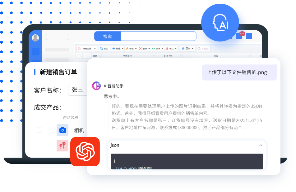 基于大模型的最新AI技术,可实现自然语言交互,企业专有AI Agent、智能统计、智能录单等